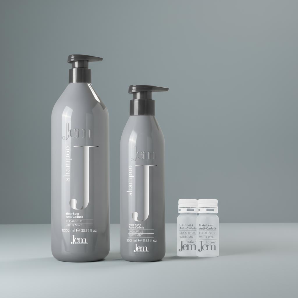 Jem Hair-loss is the energizing hair loss prevention program for fine, weak and fall-prone hair. Powered with natural extracts of Eucalyptus and White Mint it stimulates microcirculation in the skin. It tones and strengthens the hair structure by acting on the bulb bringing strength and vigor to weaker hair